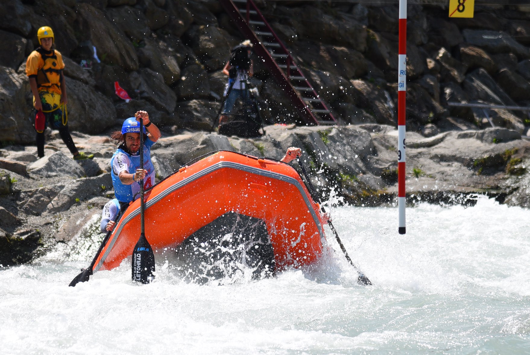 The number of gates along the slalom route must be of at least 8 (eight) and maximum of fourteen (14), of which a minimum number of 2 and a maximum of 6 must be upstream, evenly distributed on the right and left banks of the left of the river or channel.