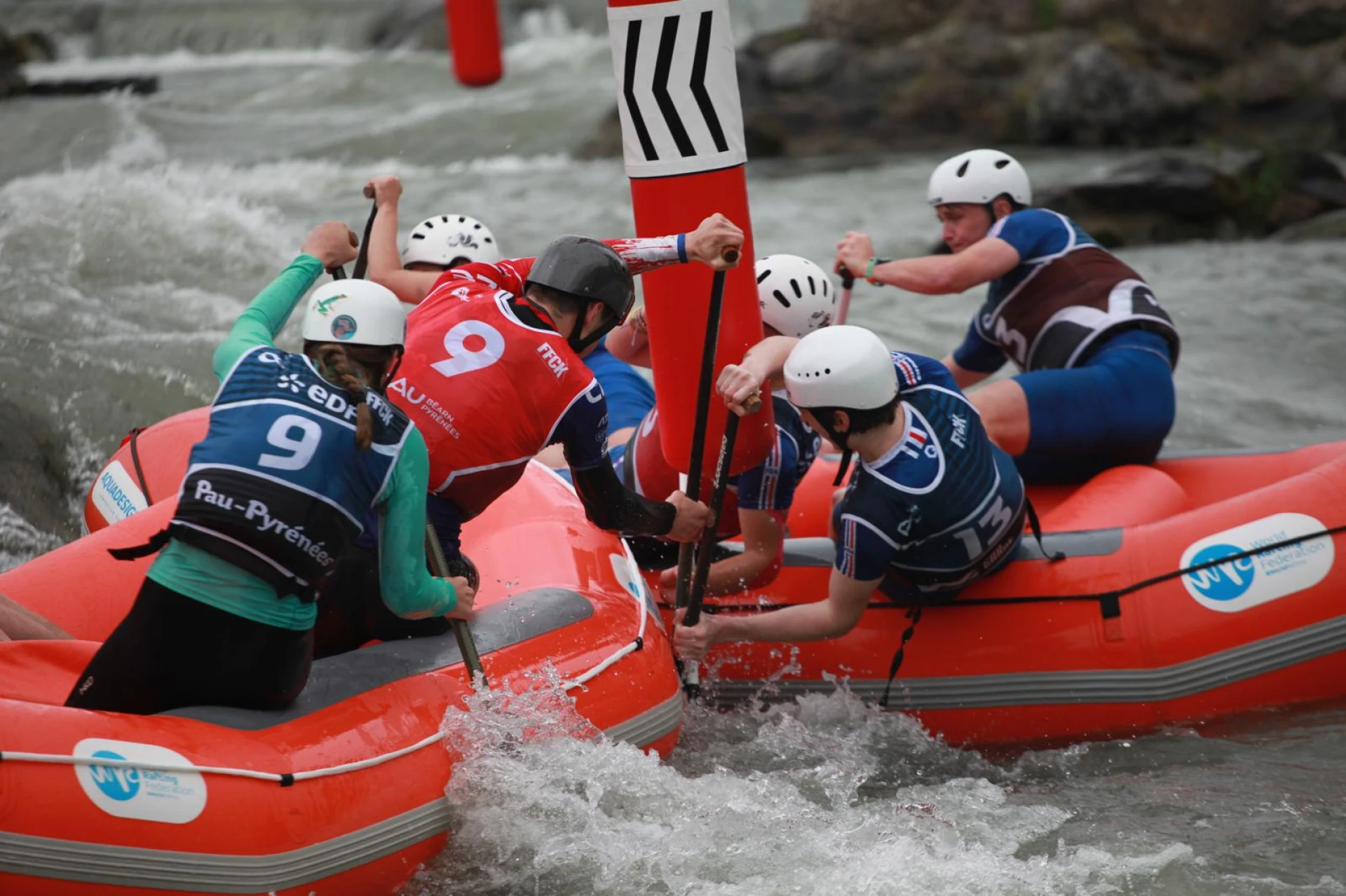 With nearly 300 athletes lining up at the start, the atmosphere was electric. The course in Pau tests every facet rafters skill, featuring two pairs of red upstream gates and two pairs of green downstream gates. In the RX format, it isn’t just about the fastest line; it’s about claiming your space and outmaneuvering the boat beside you.